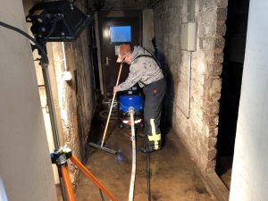 Im dritten Stock platzte vermutlich aufgrund der kalten Witterung der letzten Tage eine Rohrleitung und verwandelte das ehemalige 12 Parteienhaus in eine Tropfsteinhöhle. Sämtliche Wohnungen wurden durch die Wassermassen in Mitleidenschaft gezogen. Der Kellerbereich stand knapp 10 cm unter Wasser. Aufgrund der Wassermenge im Keller schwappte dieses in das benachbarte Gebäude und flutete teilweise auch dort den Kellerbereich. Die Nachbarn bemerkten dies im laufe des Tages und alarmierten die Baugenossenschaft. Die Hausmeister und eine Sanitärfirma öffneten die Wohnungen und stellten im kompletten Gebäude das Wasser und den Strom ab. Diese verständigten dann auch die Feuerwehr Weinheim. Diese kam mit sechs Fahrzeugen und über 20 Einsatzkräften an die Einsatzstelle. Mit mehreren Wassersaugern wurde versucht die hunderten Liter Wasser im gesamten Gebäude aufzunehmen.