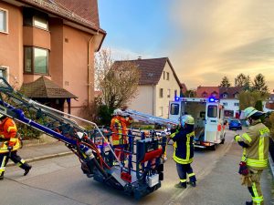 Zu einem weiteren Einsatz musste die Abteilung Stadt am Gründonnerstag gegen 20:30 Uhr ausrücken. In der Leberstraße war es zu einem medizinischen Notfall gekommen, bei dem der Rettungsdienst die Feuerwehr zur Unterstützung bei der Tragehilfe anforderte. Während ein Teil der Einsatzkräfte die Rettung über die Drehleiter vorbereitete, bautet die Besatzung des Rüstwagens der Feuerwehr einen Sichtschutz auf, da sich immer mehr Menschen an der Einsatzstelle versammelten. Daher unterstützte auch die Polizei die Rettungsarbeiten von Rettungsdienst und Feuerwehr, musste aber nicht eingreifen. Während der Patient vom Rettungsdienst versorgt wurde, kümmerte sich die psychosoziale Notfallversorgung um die Betreuung von Angehörigen. Nach einer Stunde konnte der Einsatz beendet werden.