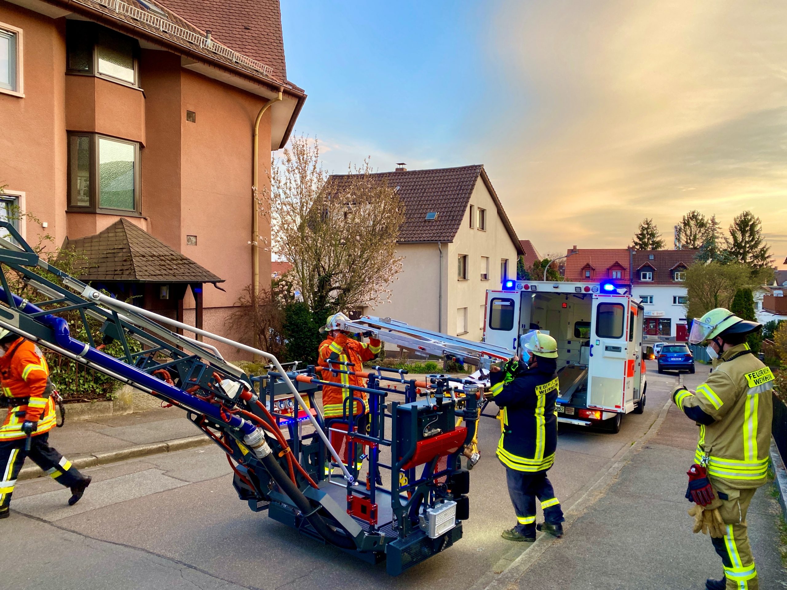 Zu einem weiteren medizinischen Notfall, forderte der Rettungsdienst die Feuerwehr am Samstagabend zur Unterstützung mit der Drehleiter nach. Aufgrund eines technischen Defektes stand die Drehleiter der Feuerwehr Weinheim nicht zur Verfügung, so dass die Drehleiter der Feuerwehr Hemsbach dem Einsatz gegen 19:30 Uhr mit zugeteilt wurde. Gemeinsam wurde die Rettung durch die eingesetzten Feuerwehren vorbereitet. Nachdem der Rettungsdienst die Erstversorgung des Patienten abgeschlossen hatte, wurde dieser über die Drehleiter patientengerecht und schonend gerettet. Von dort ging es zur weiteren Behandlung ins Krankenhaus. Während der Rettungsmaßnahmen musste die Gernotstaße und Siegfriedstraße gesperrt werden. psychosoziale Notfallversorgung um die Betreuung von Angehörigen. Nach einer Stunde konnte auch dieser Einsatz beendet werden. Zur Unterstützung der Angehörigen wurde auch hier die psychosoziale Notfallversorgung der Weinheimer Feuerwehr in den Einsatz eingebunden. Nach einer Stunde konnte der Einsatz beendet werden, bei dem einmal mehr die gute Zusammenarbeit der Feuerwehren und den Rettungsdienst unter Beweis gestellt wurde.