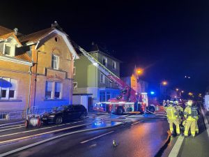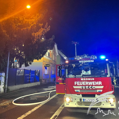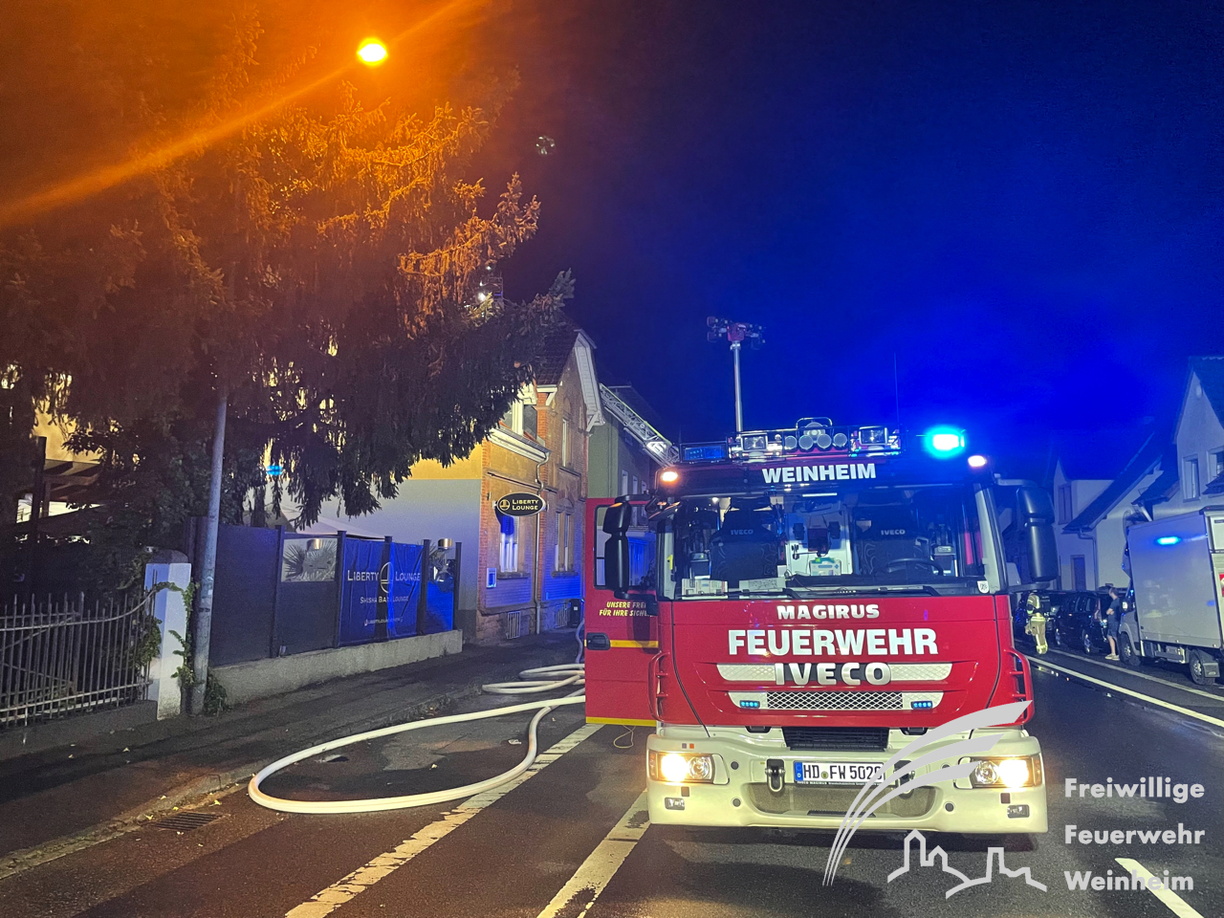 Die Freiwillige Feuerwehr Weinheim löschte mit den Abteilungen Stadt und Sulzbach in der Nacht auf Donnerstag einen Brand in der Bergstraße. In einem Abluftrohr war ein Brand ausgebrochen und breitete sich auf Teile des Dachstuhls aus.