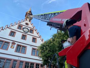 Bereits am Vormittag war die Feuerwehr im Einsatz. Am Morgen rückte die Drehleiter an den Marktplatz aus. Es machte den Anschein, dass die Wetterfahne des Alten Rathaus nicht mehr festsitzt. Die Feuerwehr sicherte die Wetterfahne in Zusammenarbeit mit der Haustechnik und konnte die Einsatzstelle an diese übergeben.