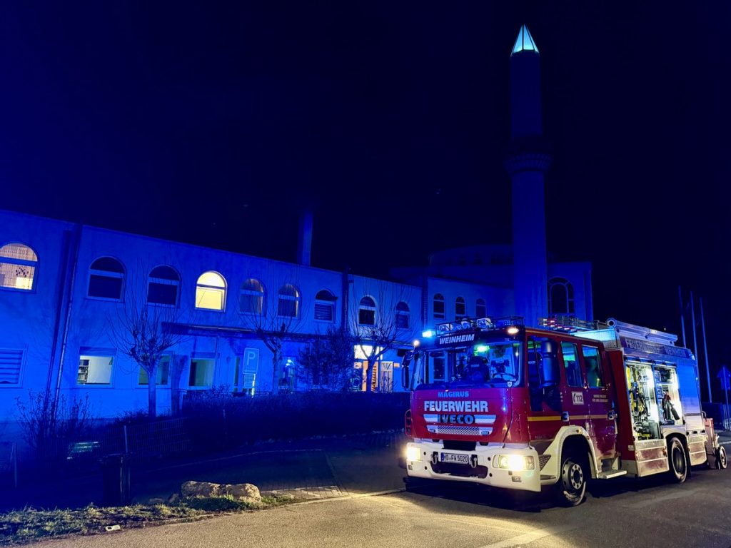 Am Sonntagabend rückte die Feuerwehr Weinheim mit den Abteilungen Stadt und Sulzbach gegen 22 Uhr in die Moschee (Bergstraße) zu einer ausgelösten Brandmeldeanlage aus. Als die ersten Einsatzkräfte eintrafen, war das Gebäude bereits geräumt. Zur Kontrolle ging ein Trupp unter Atemschutz mit Kleinlöschgerät zur Erkundung vor. Die Einsatzkräfte kontrollierten den betroffenen Bereich, fanden aber kein offenes Feuer. Im Küchenbereich wurde eine leichte Verrauchung festgestellt. Schnell konnte auch die Ursache gefunden werden.