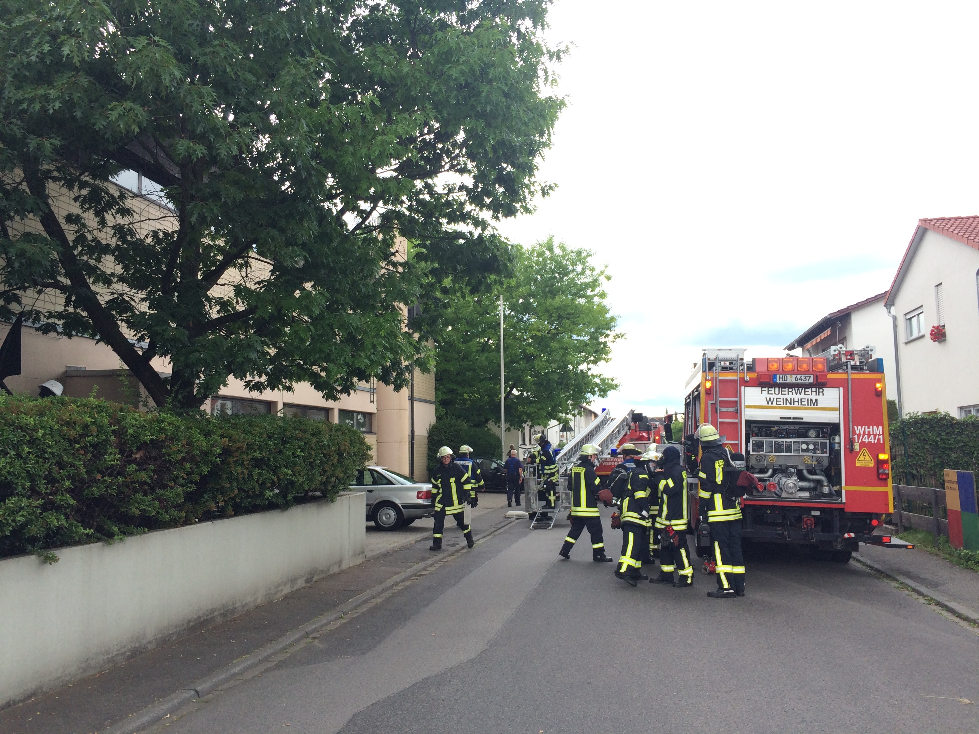 Während erste Trupps ins Gebäude zur Menschenrettung und Brandbekämpfung vorgingen, wurde parallel die Wasserversorgung aufgebaut. Mit Hilfe des Einsatzleitwagens der Feuerwehr wurde die Einsatzstelle strukturiert, Funkkanäle vergeben und mehrere Abschnitte gebildet. Außerdem wurde die Drehleiter in Stellung gebracht und mit Lüftern die Entrauchung des Gebäudes vorbereitet. Ziel der Übung war vor allem die Absprache untereinander zu verbessern. Gerade bei der Größe des Objekts war hier Koordination innerhalb der eingesetzten Trupps unter Atemschutz sehr wichtig um schnell und flächendeckend den verrauchten Keller nach Personen abzusuchen. Auch die Führungskräfte waren gefordert Absprachen zu treffen um den Einsatz schnell und zielführend abzuarbeiten. Hilfreich war hier auch der Einsatz eines Feuerwehrplans der für das Gemeindezentrum zur Verfügung steht. Der Feuerwehrplan ist ein vorbereiteter Plan für die Brandbekämpfung und für Rettungsmaßnahmen an besonderen Orten oder Objekten. Feuerwehrpläne gibt es inzwischen für viele Gebäude im Weinheimer Stadtgebiet. Sie stehen als Führungsmittel zur Verfügung und dienen der Einsatzvorbereitung, der besseren Orientierung sowie der Beurteilung der Lage.